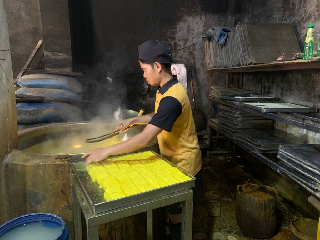 Kamis siang (9/10/2025), sejumlah pekerja terlihat sibuk bekerja mengolah kacang kedelai menjadi olahan tahu yang siap dijual langsung kepada konsumen. Prosesnya tentu memakan waktu berjam-jam. Mulai perendaman bahan kedelai selama empat jam, penggilingan, pemisahan sari kedelai dari ampasnya, kemudian pencetakan dan pemberian larutan kunyit.